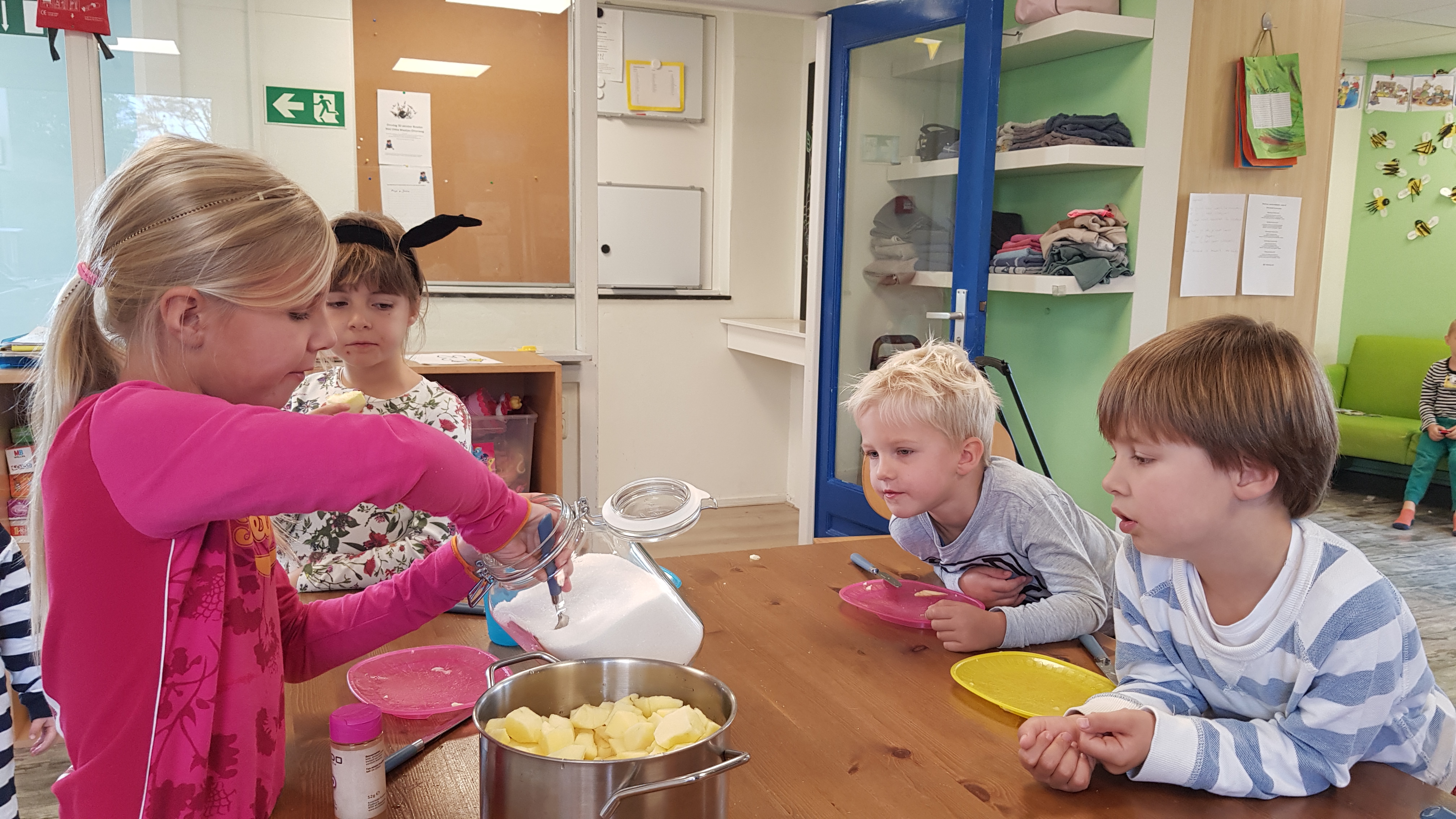 Woensdag 24 oktober hebben we zelf appelmoes gemaakt. Eerst de appels geschild en in stukjes gesneden, suiker en kaneel er bij, en goed roeren in de pan. Aan elke potje zit een zelf gemaakte naam plaatje. De kinderen hebben de naam plaatjes kinderen gemaakt met slag letters.