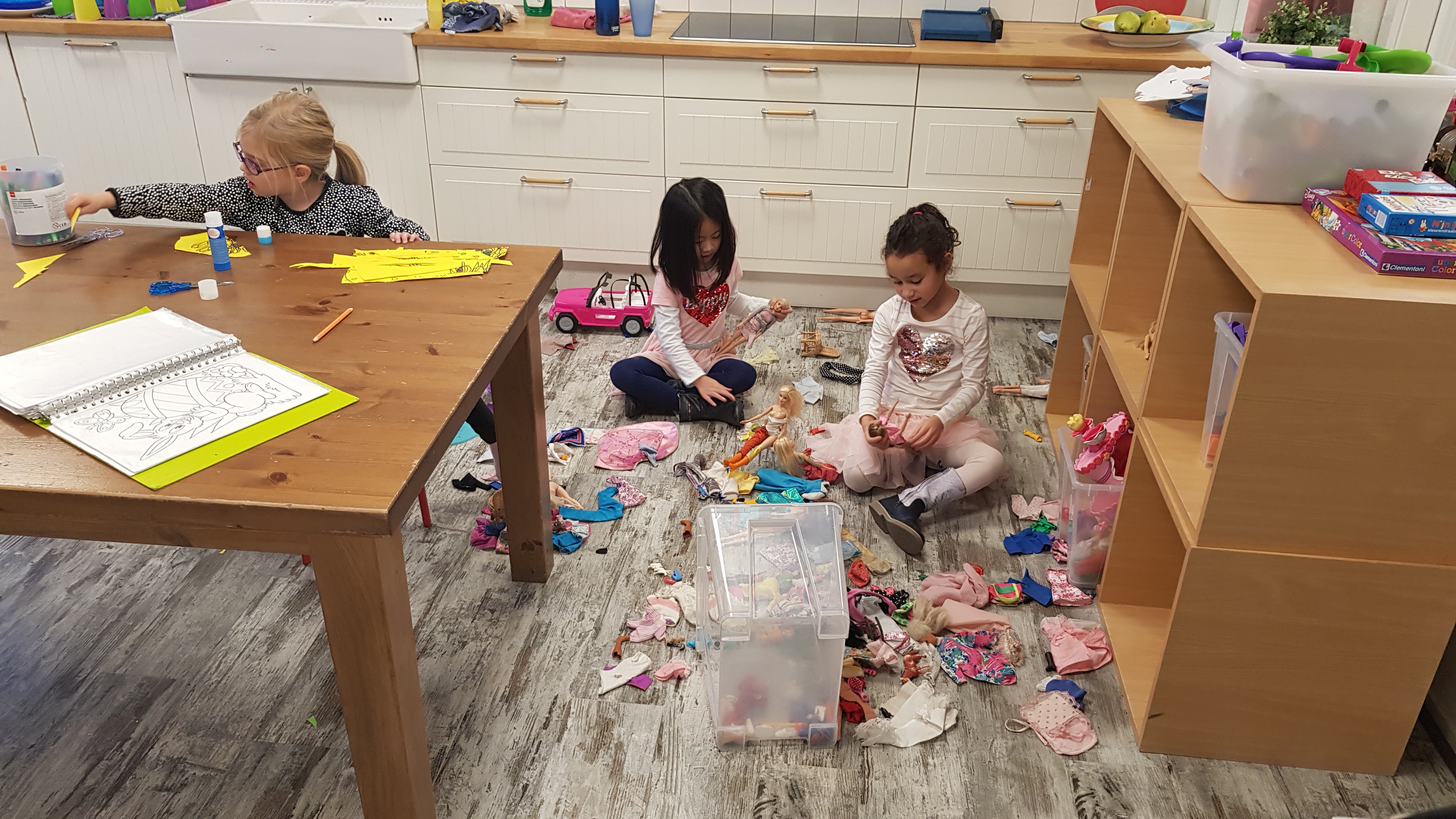 De mannen waren een ford aan het bouwen voor de soldaten, de meiden waren kunstwerken aan het maken met verf en glitters en er werd druk met de barbies gespeeld