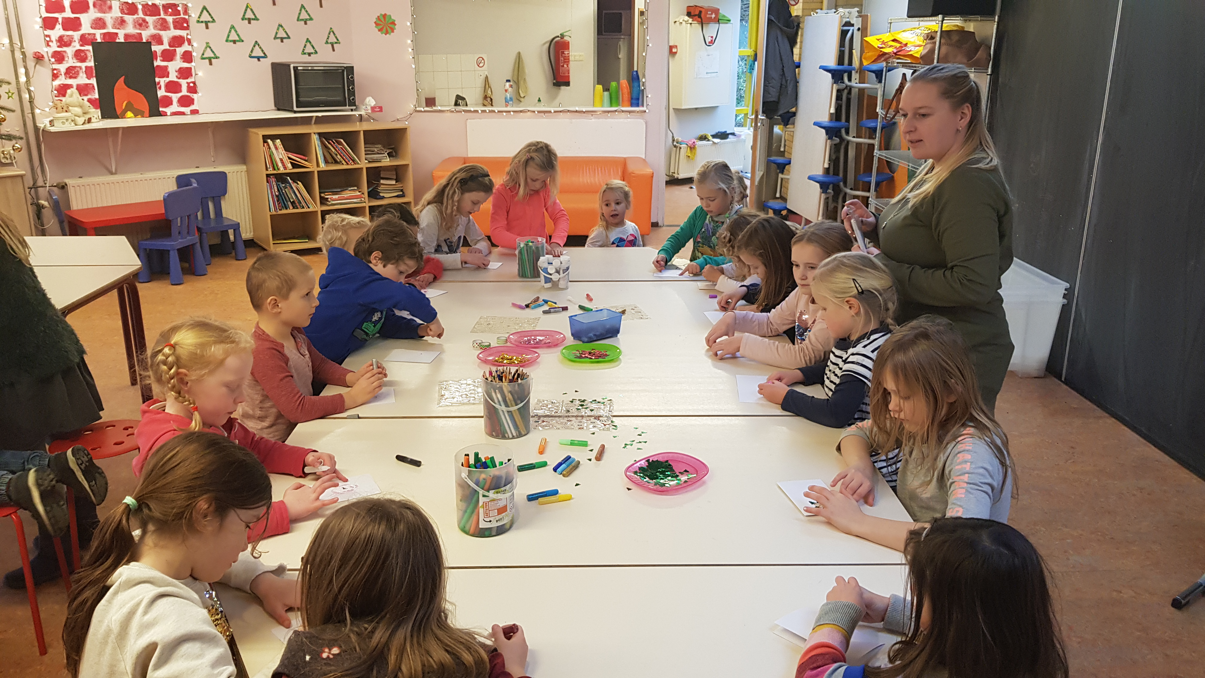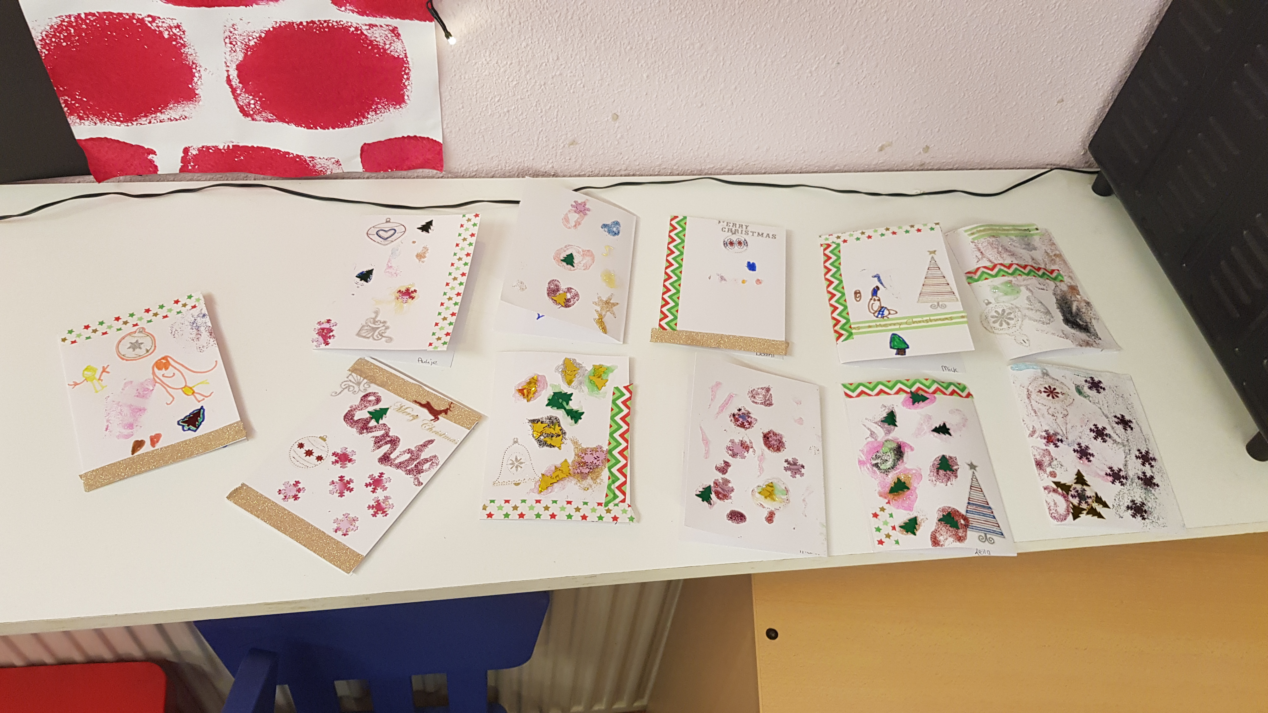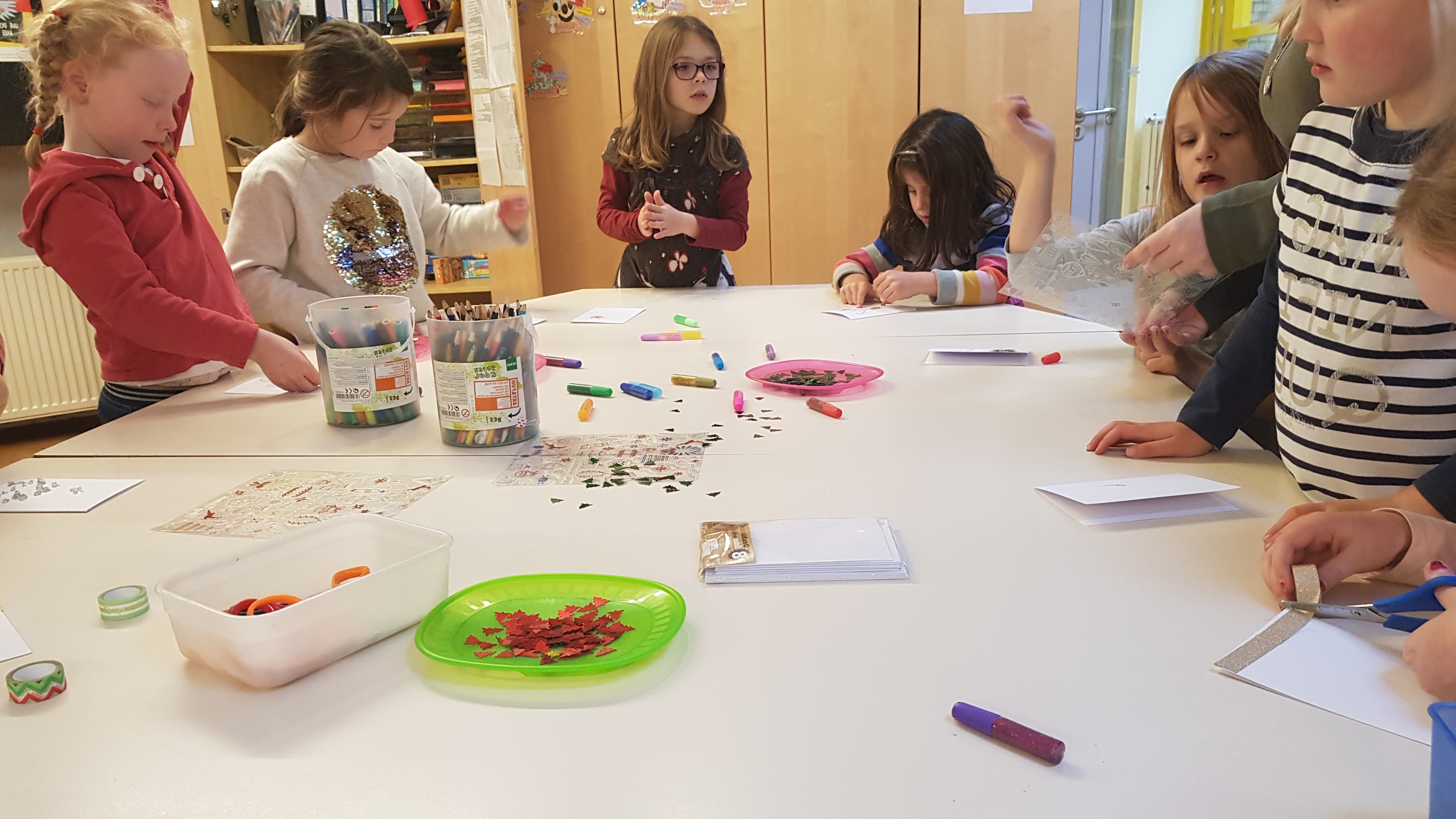 Vandaag (maandag 18 december) stond in het teken van kerstkaarten maken. De kinderen mochten helemaal zelf bepalen wat er op kwam. Ze konden kiezen uit stickers,glitterstiften kersttape gekleurde boompjes