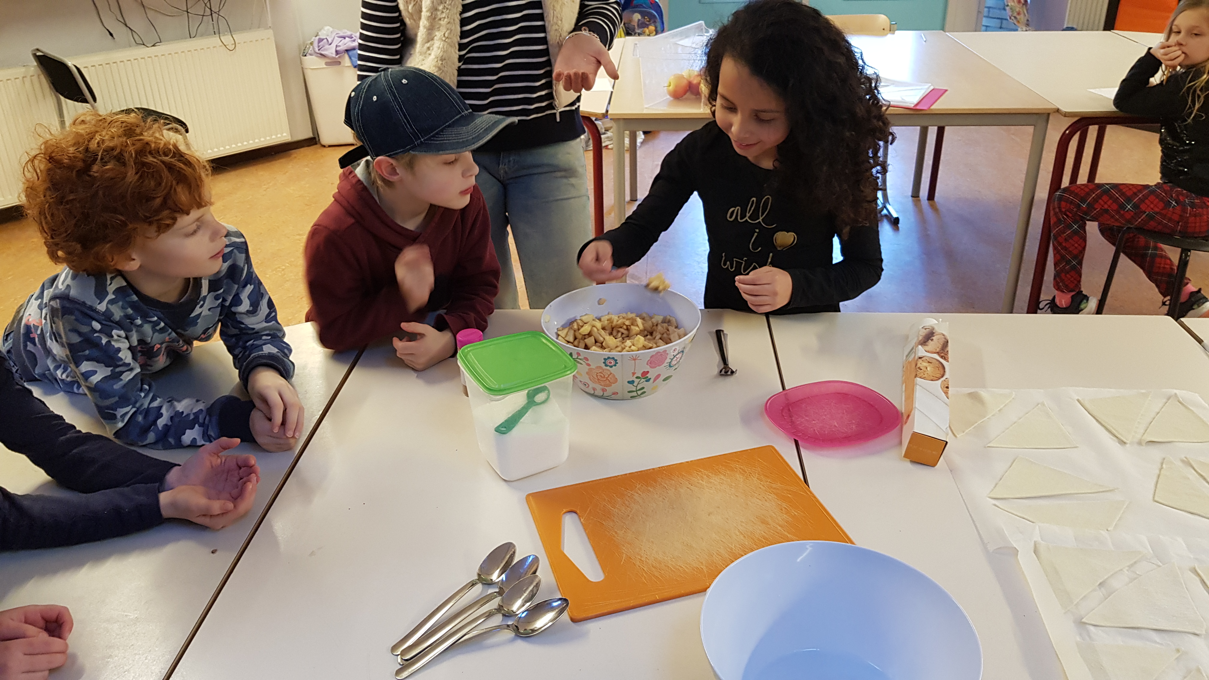 De kinderen hebben zelf de appels gesneden en de suiker en kaneel toegevoegd.