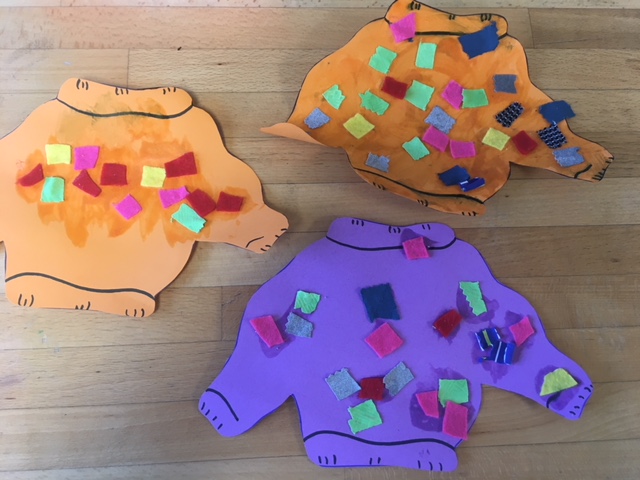 Op de peuterplus hebben we heerlijke warme wintertruien gemaakt. We gingen met stofjes plakken. Dit voelt weer anders aan dan papier. Ook mochten we lekker veel lijm smeren van juf zodat de stofjes goed blijven plakken. Het zijn vrolijke truien geworden