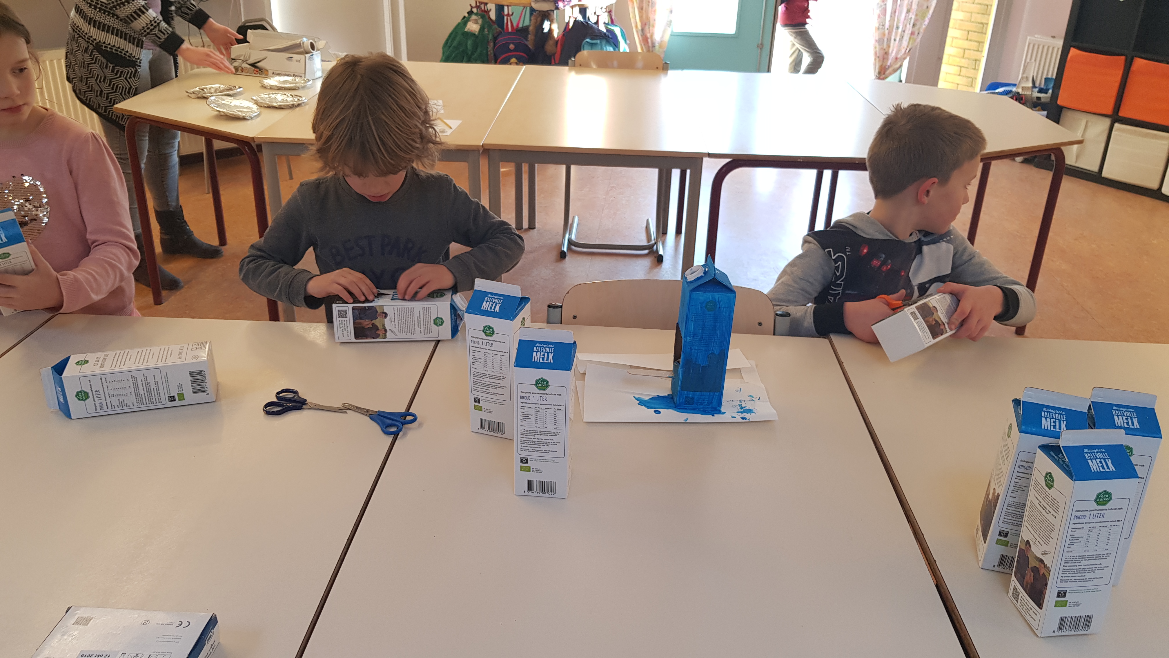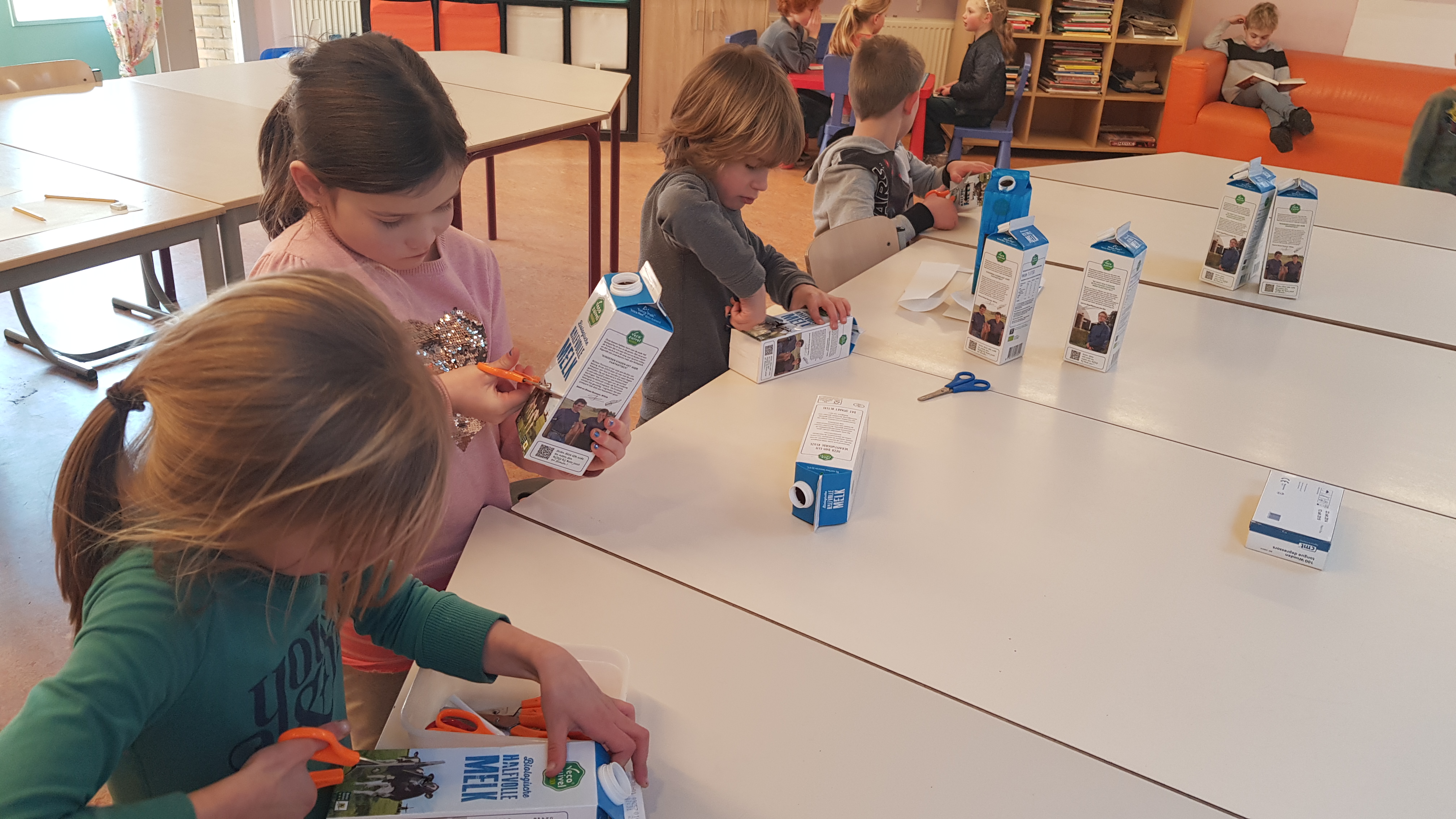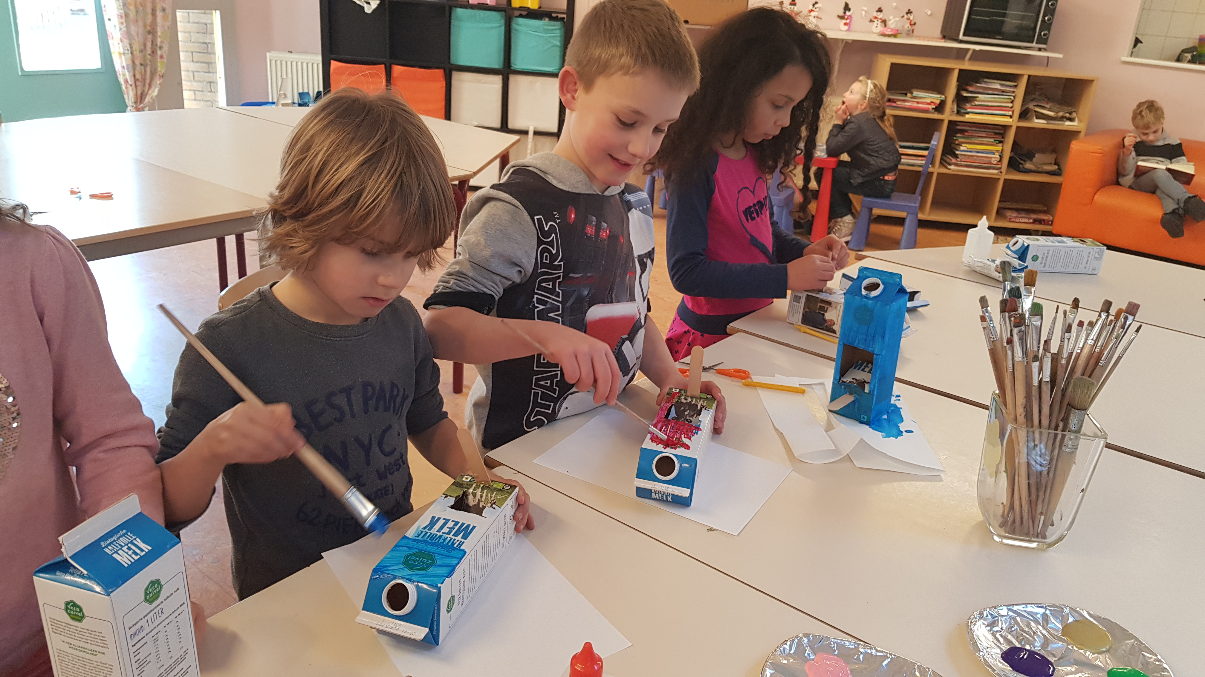Vandaag (dinsdag 6 februari) gingen wij vogelhuisjes maken van melkpakken. De kinderen hebben zelf het gat in het melkpak gemaakt en hebben het pak mooi versierd. De huisjes zien er nu vrolijk uit de vogeltjes. Aan de binnenkant van het pak hebben we pindakaas gesmeerd en daar werd het vogelzaad op gedaan. Eetsmakelijk vogeltjes!