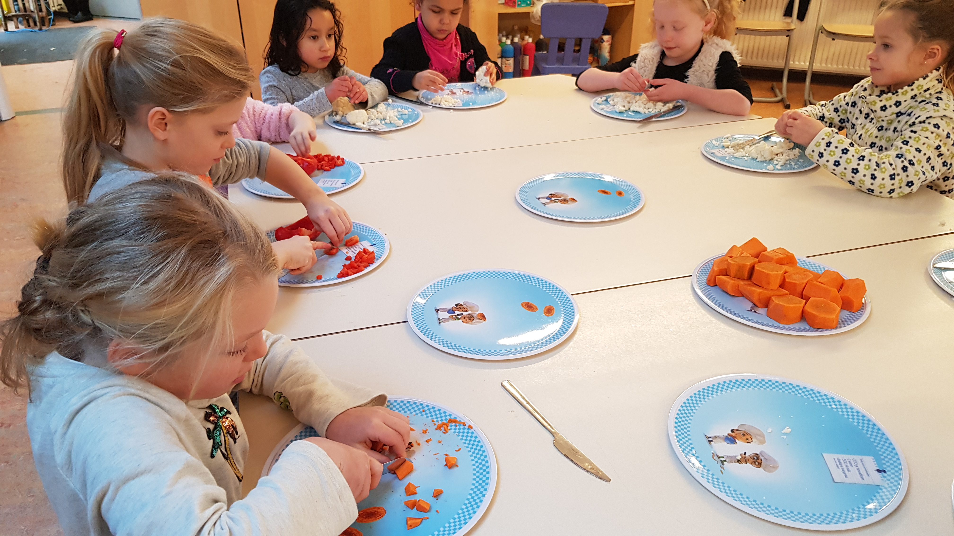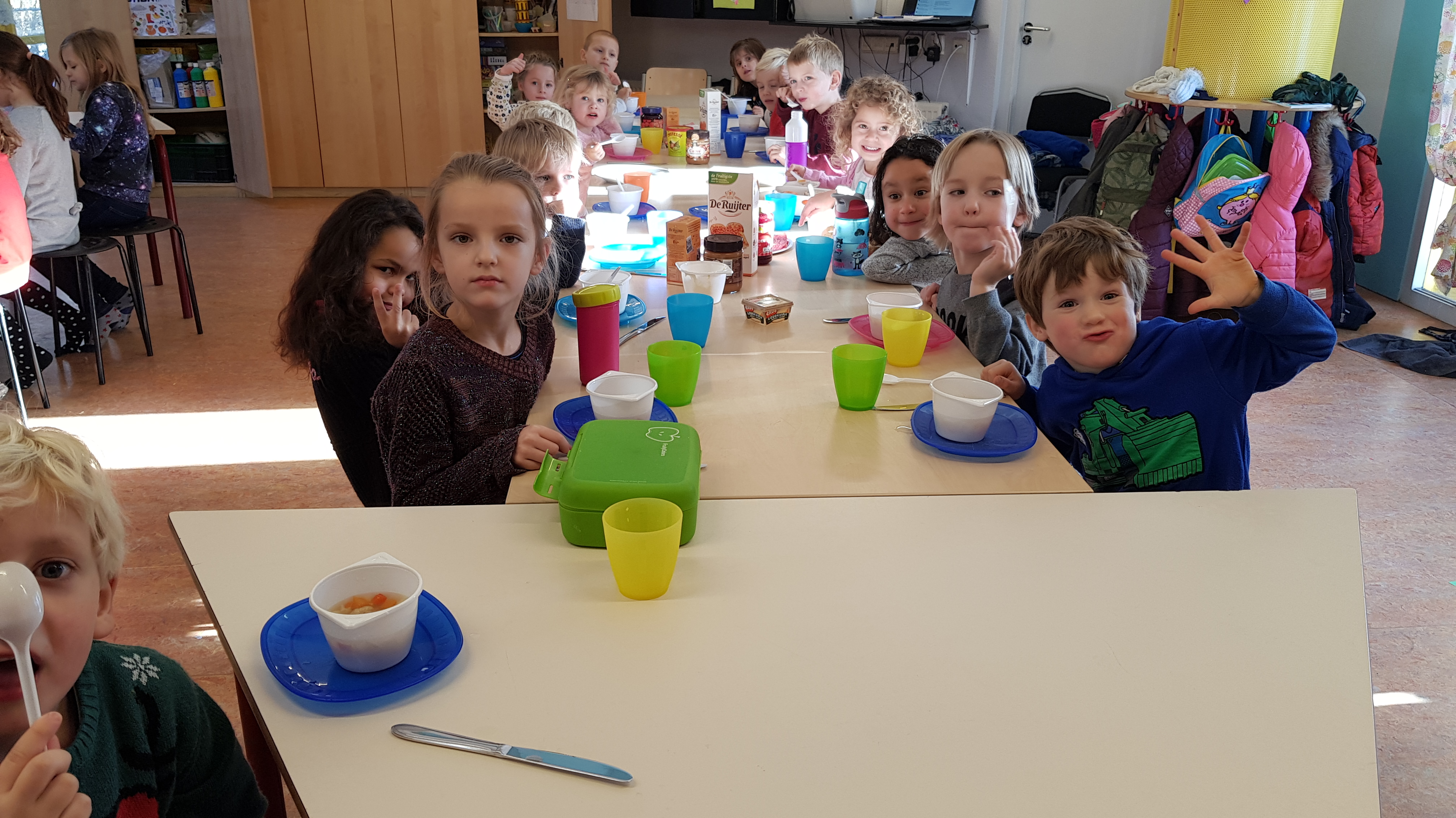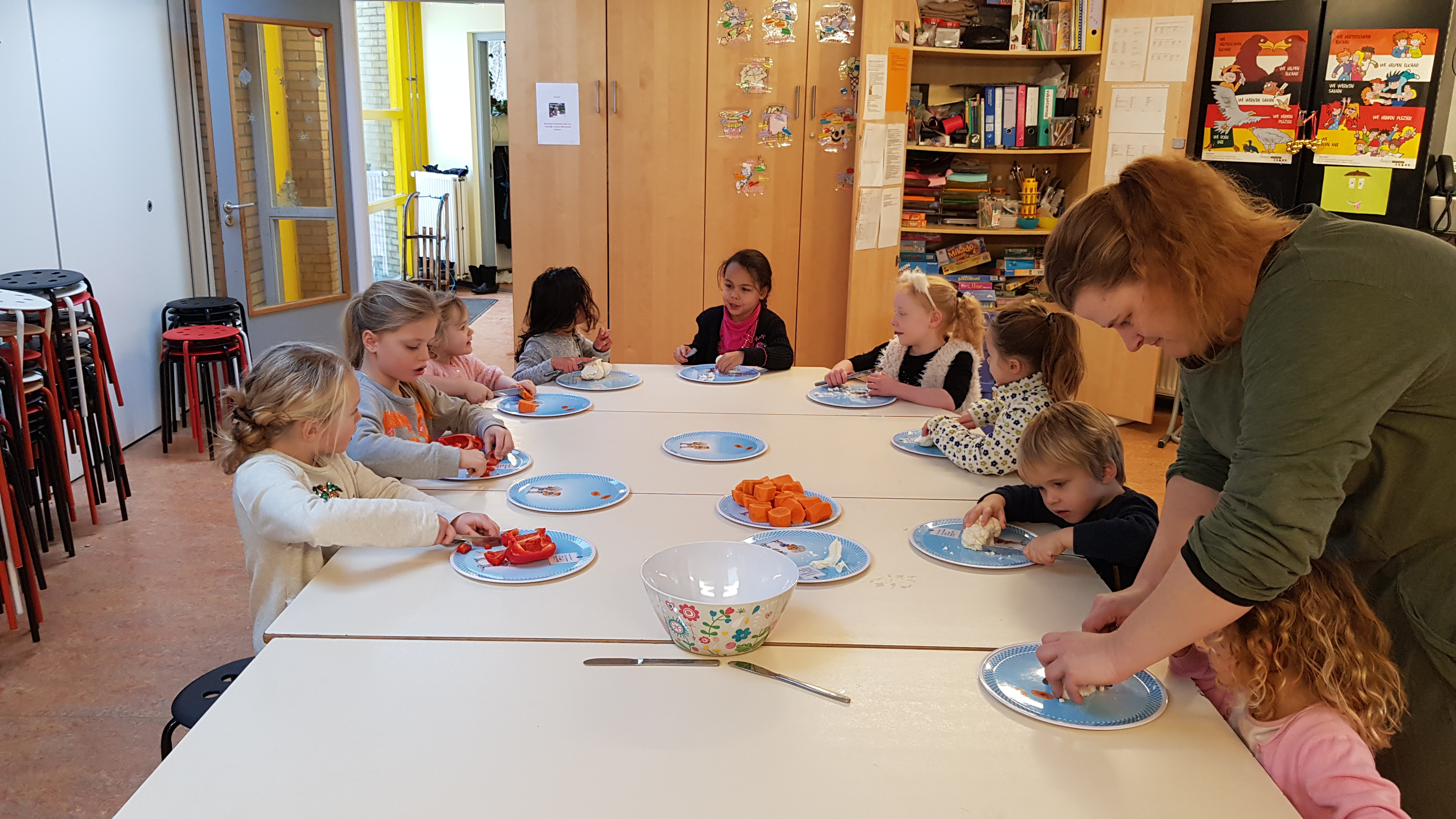De juffen en meester gingen vandaag staken. En daarom waren de kinderen vandaag de hele dag bij Dikke Maatjes. Na weer lekker in de sneeuw te hebben gespeeld zijn wij groentesoep gaan maken. De kinderen hebben zelf alle groenten gesneden, paprika, bloemkool, wortel en ui. Ook hadden we zelf gehakt balletjes gemaakt. Alles in de grote pan met water en bouillon even goed laten koken…. en eten maar. Wat was het heerlijk!