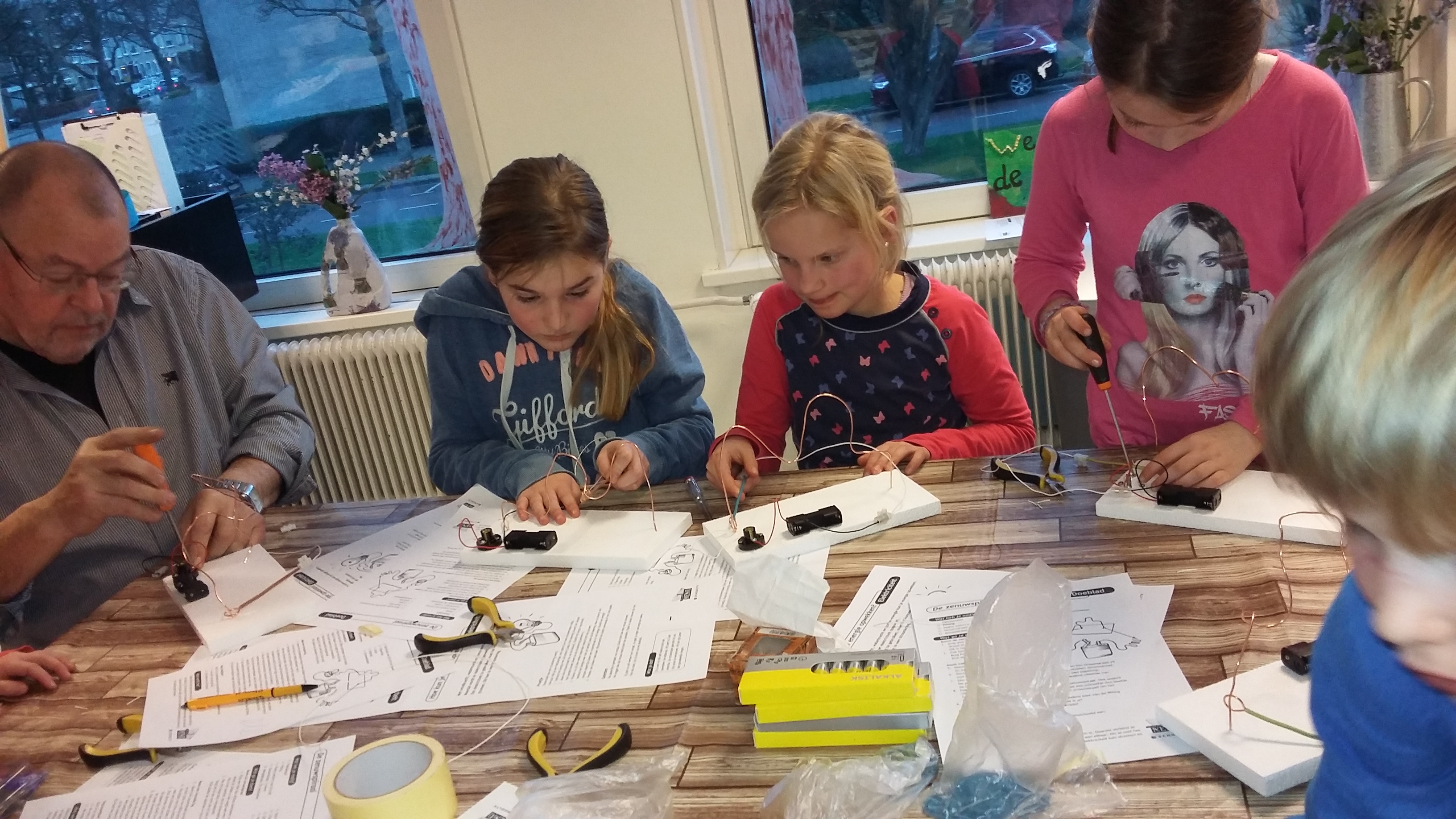 Jaap kwam om 15.30 uur en heeft alles klaar gezet. We hebben eerst met zijn allen gekeken hoe het er uit zag en zijn daarna begonnen met het opbouwen.