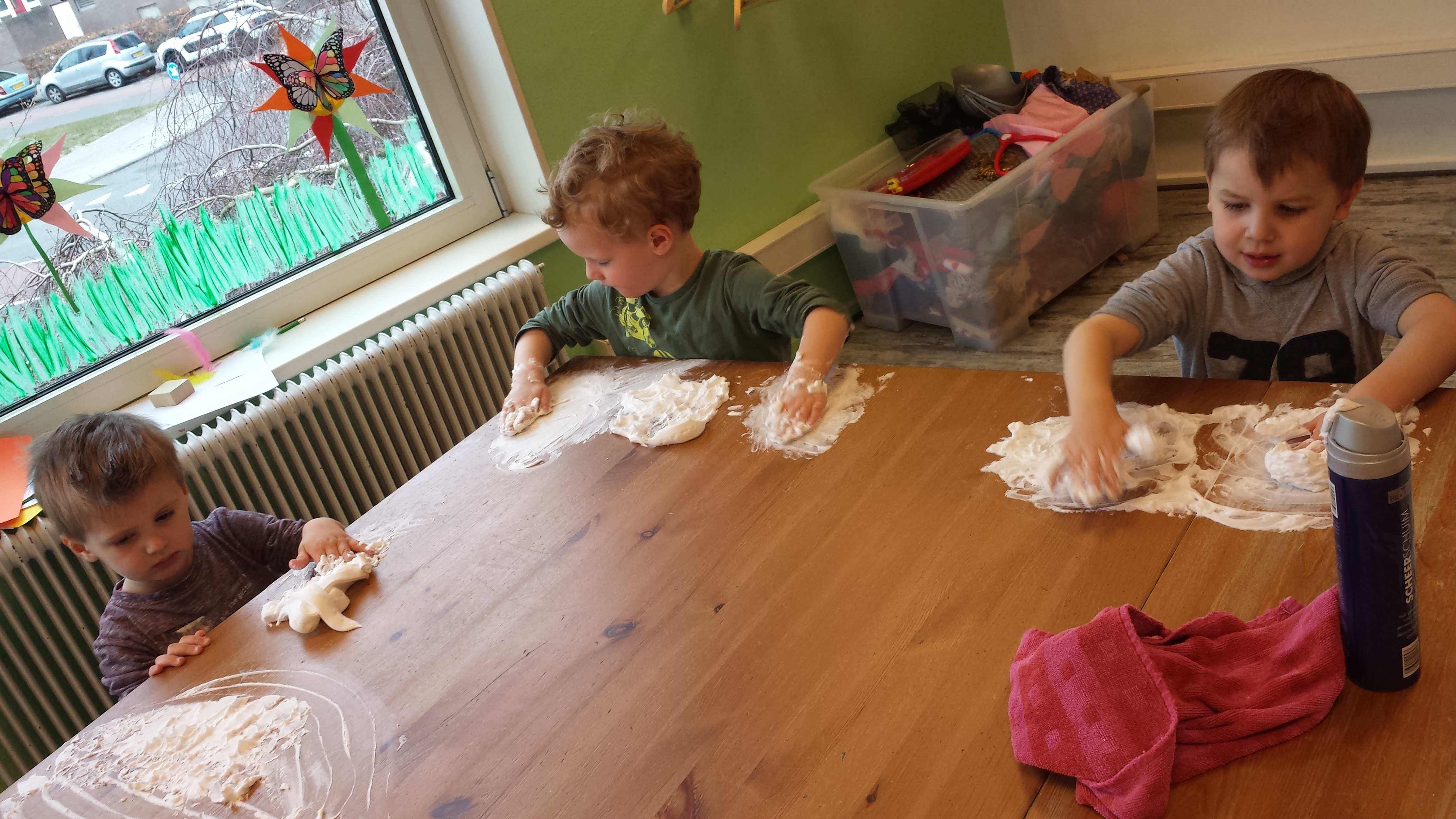 Heerlijk met scheerschuim aan het werk op de 3+. Dat onze handen vies worden is helemaal niet erg zegt juf want met water zijn ze zo weer schoon. Lekker zacht was het scheerschuim. Je kon er tekeningen maken, bergjes maken en nog veel meer. Wat was het leuk!